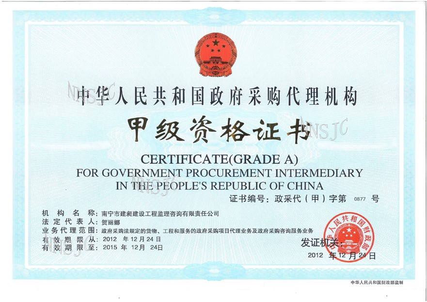 我公司于2009年12月28日獲得政府采購(gòu)代理機(jī)構(gòu)甲級(jí)資質(zhì),證書編號(hào)政采代(確)字第0582號(hào)(有效期2009年12月28日至2012年12月28日)。根據(jù)《政府采購(gòu)代理機(jī)構(gòu)資格認(rèn)定辦法》(財(cái)政部第61號(hào)令)和《財(cái)政部關(guān)于認(rèn)真做好政府采購(gòu)代理機(jī)構(gòu)資格認(rèn)定工作的通知》(財(cái)庫(kù)[2010]133號(hào))有關(guān)文件精神,我公司于2012年底開展政府采購(gòu)代理機(jī)構(gòu)甲級(jí)資質(zhì)延續(xù)工作,并于2012年12月28日獲取證書。